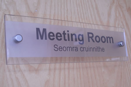 Clear Perspec panel with Black SAV Lettering and backed with Frosted SAV panel, mounted to internal doors on Satin Chrome Distance Holders.
