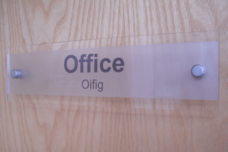 Clear Perspec panel with Black SAV Lettering and backed with Frosted SAV panel, mounted to internal doors on Satin Chrome Distance Holders.