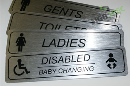 Brushed Stainless Steel Effect Composite Aluminium Signs with Black Graphics. These are sold with an adhesive backing.